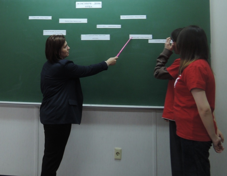 16 октября для ребят детского объединения «Школа лидера» (руководитель Никитаева И.А.) была проведена беседа ко Дню отца. Цель: познакомить детей с историей возникновения праздника «День отца»; привлечь внимание детей к важнейшей роли мужчины в обществе. Задачи: расширять представления детей о празднике «День отца»; расширять представления детей о роли отца в воспитании детей, в организации их жизни и свободного времени; развивать понимание роли отца как родителя (участие в воспитании детей) и гражданина (участие в труде и жизни общества); развивать этические чувства, доброжелательность и эмоционально-нравственную отзывчивость к членам семьи, воспитывать любовь, ласковое, чуткое отношение к папе, чувство гордости за своего отца. Ребята рассказали, когда появился праздник, историю его возникновения, в каких странах, кроме России отмечается? Обучающиеся обсудили пословицы о папе, такие как: «Отец и мать - священные слова», «Слава сына - отцу отрада», «Умный сын - отцу замена, а глупый — не в помощь», «Где хороший отец, там и сын молодец», Отец наказывает, отец и хвалит», «Каков отец, таков и сын», «Сын-то он мой, да ум-то у него свой». В это день мы выражаем особое отношение - любовь и благодарность к дорогому человеку.