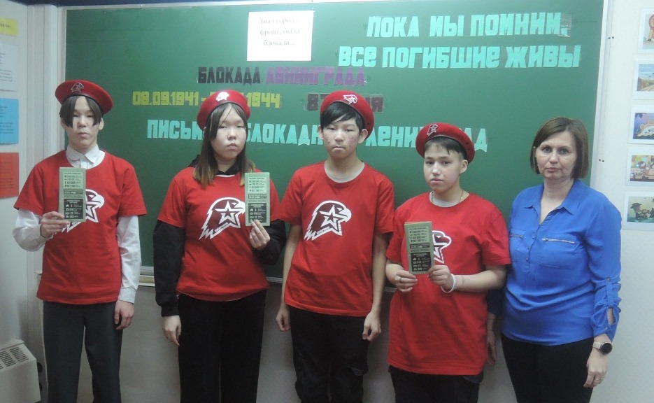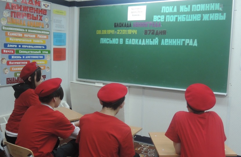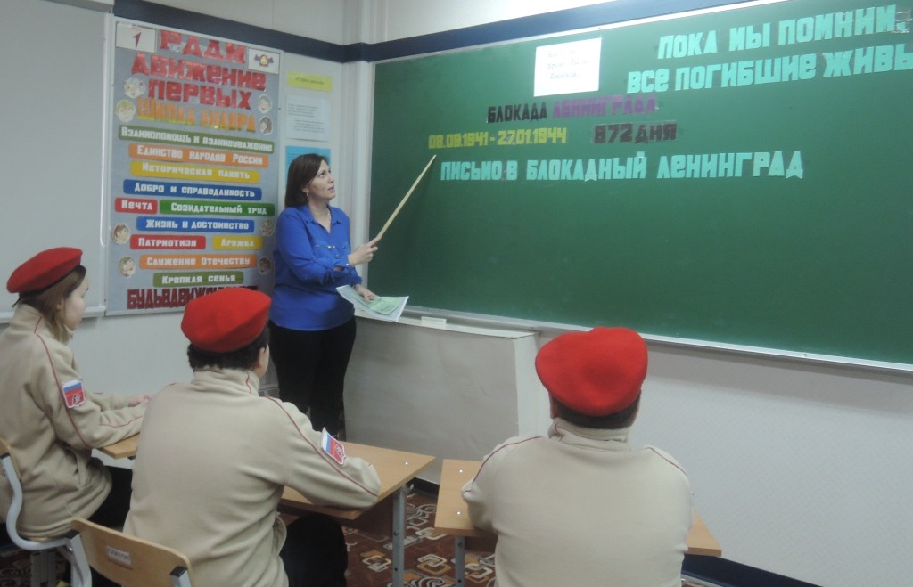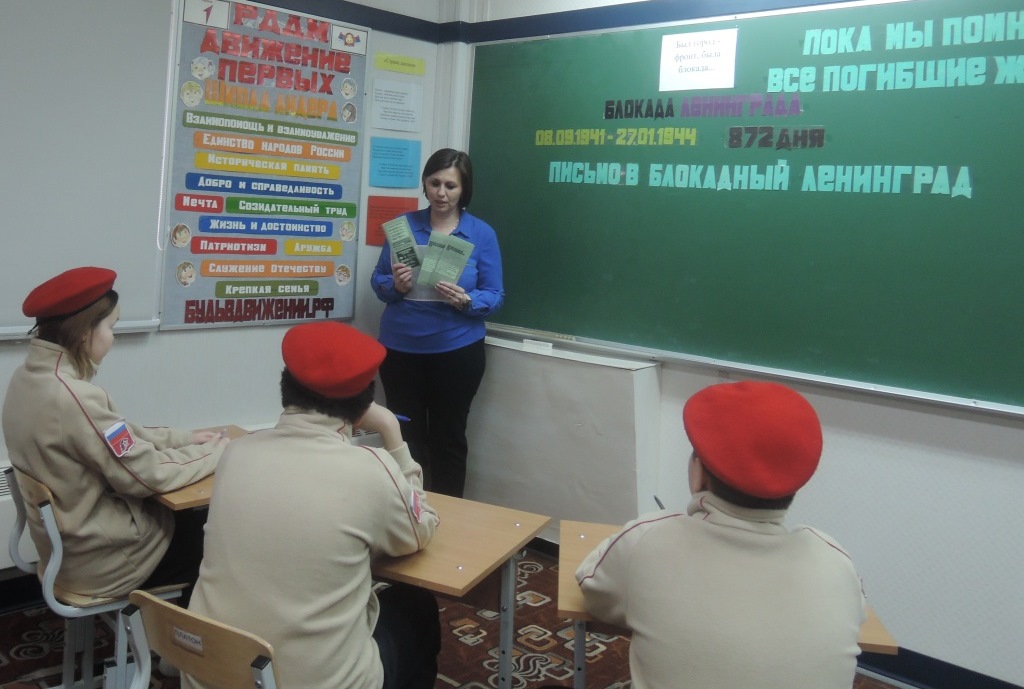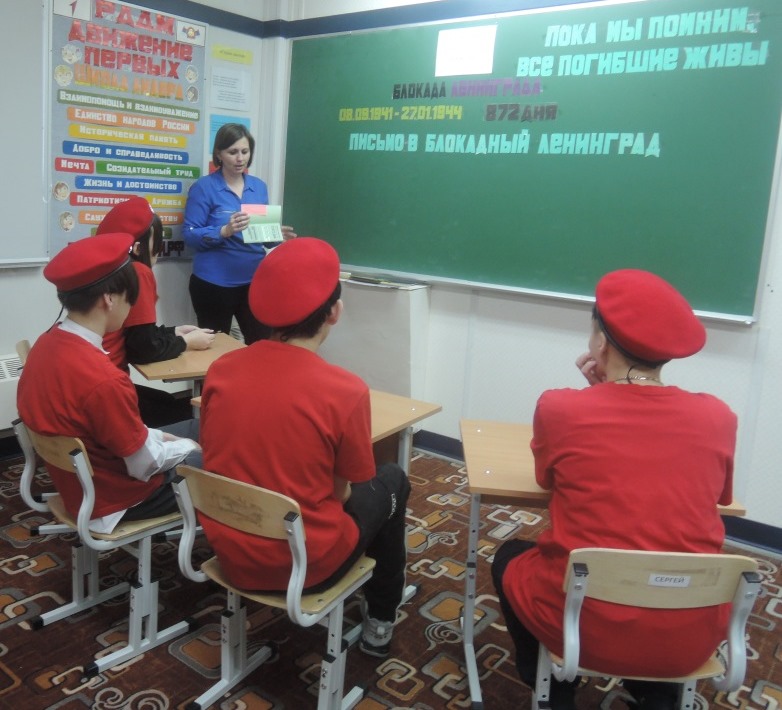 Блокада Ленинграда – одна из самых трагичных страниц истории нашей страны. Блокада Ленинграда – это не локальная история одного города. Она звучным эхом отозвалась в сердцах всего советского народа. Каждый день его жителей – это подвиг, память о котором передается от поколения к поколению. 27 января для воспитанников юнармейского отряда «Патриот» был проведён час памяти «Был город - фронт, была блокада...». Цель - познакомить с одной из наиболее трагических страниц Великой Отечественной войны – блокадой Ленинграда; рассказать о жизни и подвигах детей-ленинградцев; воспитывать патриотизм и гордость за нашу страну, выстоявшую в борьбе с фашизмом; показать мужество и героизм жителей и защитников города; развивать интерес к историческому прошлому Родины. Лозунг беседы «Никто не забыт, ничто не забыто». Воспитанникам рассказали о страшных днях блокадного Ленинграда, о героическом сопротивлении наших войск под Ленинградом, о тяжелейших испытаниях, которые выпали на долю жителей города: голоде, холоде, ежедневных бомбардировках. В ходе мероприятия ребятам показали как выглядел кусочек блокадного хлеба, талон, по которому жителям блокадного Ленинграда выдавали паёк. Все получили листовки с описанием состава хлеба, который выпекали в блокадном Ленинграде. Ребята написали поздравления с праздником – с Днём снятия Блокады Ленинграда, обращаясь к жителям – ленинградцам -победителям, которые и через столетия останутся примером несгибаемого мужества, веры и стойкости.